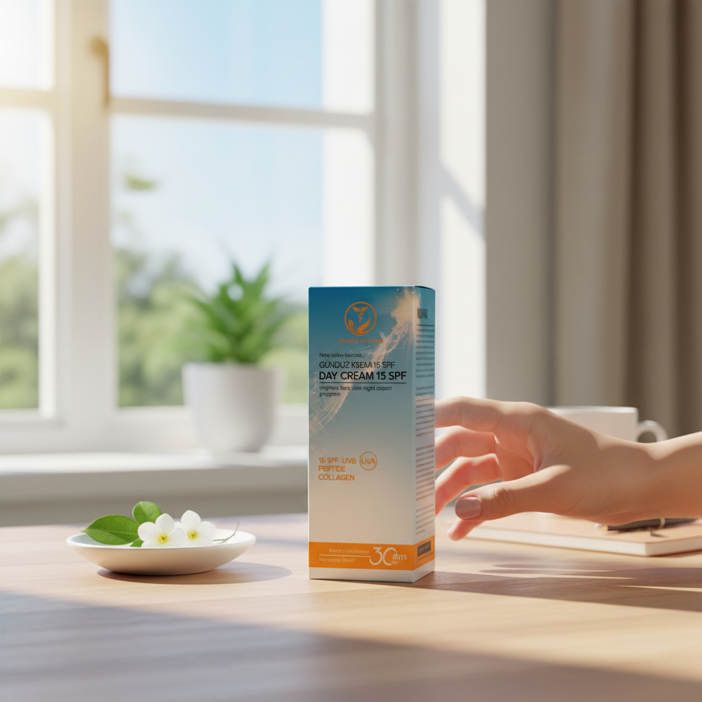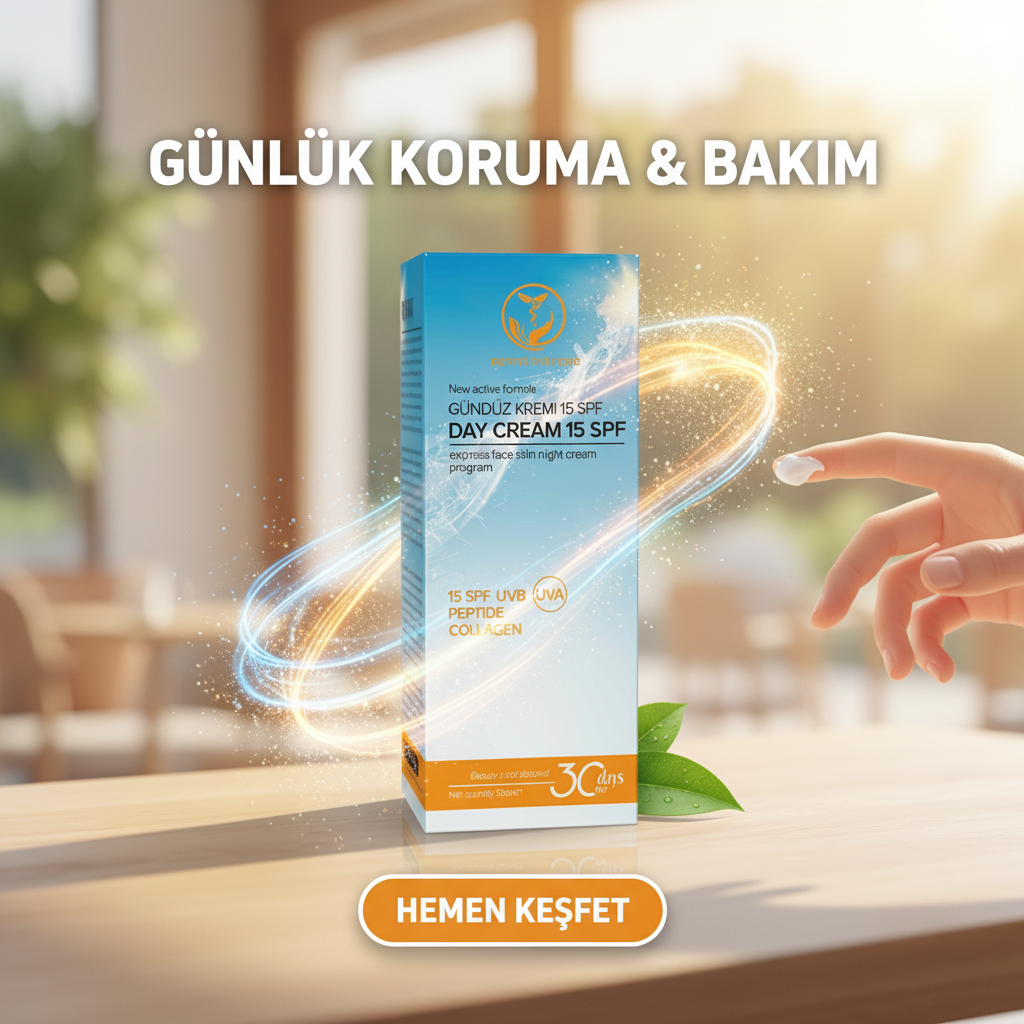 15 SPF UVB ve UVA koruması içeren, peptit ve kolajen destekli gündüz yüz kremi.