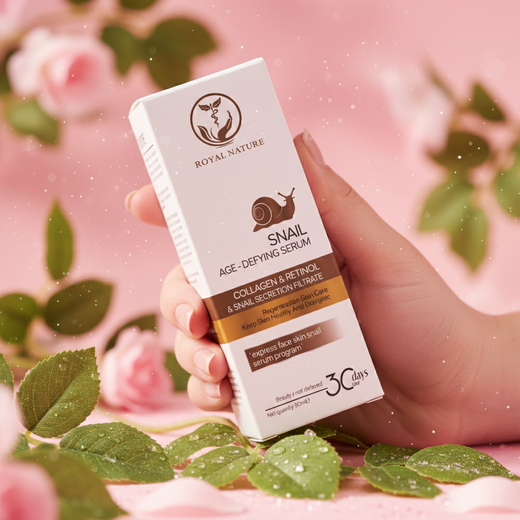 Royal Nature Salyangoz Yaşlanma Karşıtı Serum, ambalaj üzerinde belirtilen kolajen, retinol ve salyangoz salgı filtratı içeren özel formülü ile cilt bakım rutininize destek olmak üzere tasarlanmıştır.